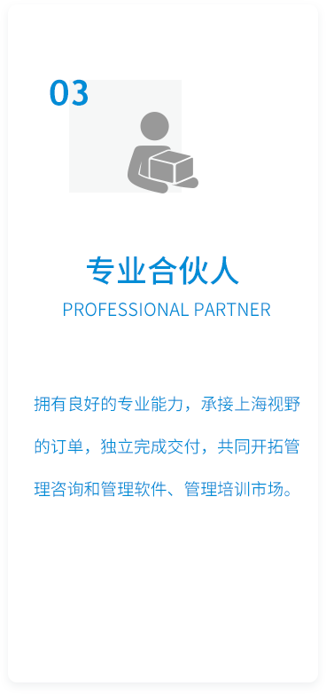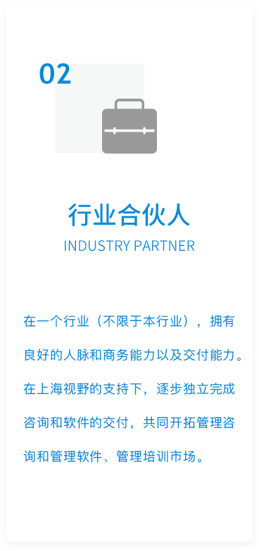 成立二十年来,上海视野励精图治,稳步发展,逐渐在国内管理控制咨询和数字化转型领域积累了颇具规模且稳定的客户群体,在行业内逐步产生了一定的影响力。为将上海视野发展到一个新高度,满足上海视野扩张需要,继续扩大视野品牌影响力,我们将向全社会寻找认同公司发展战略和企业文化,并且意愿与上海视野共同成长的合作伙伴。